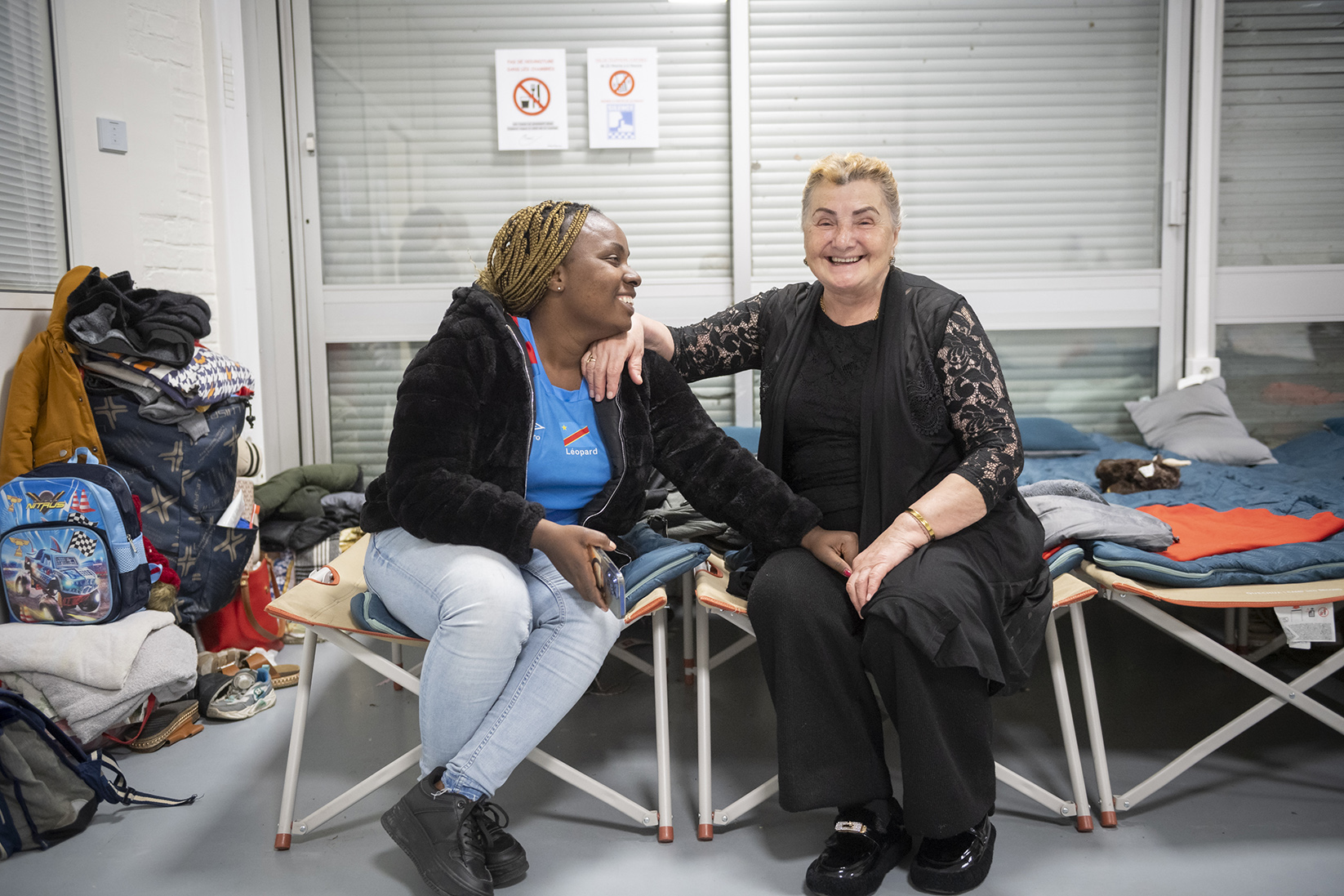 Dans le couloir, les bénévoles du soir arrivent par petits groupes. Jean-Pierre, vingt ans d’engagement derrière lui. Carole, sa première fois à l’accueil de nuit. Ils accrochent leurs manteaux, saluent les femmes par leur prénom. Dans le dortoir, Sabine, bénévole, est penchée vers Joyce. Elle vérifie où en est sa demande d'asile. C'est sa deuxième année ici. « Ce qui m'épate, ce sont les enfants. Ils ont toujours le sourire alors qu'ils sont dans des situations compliquées. »